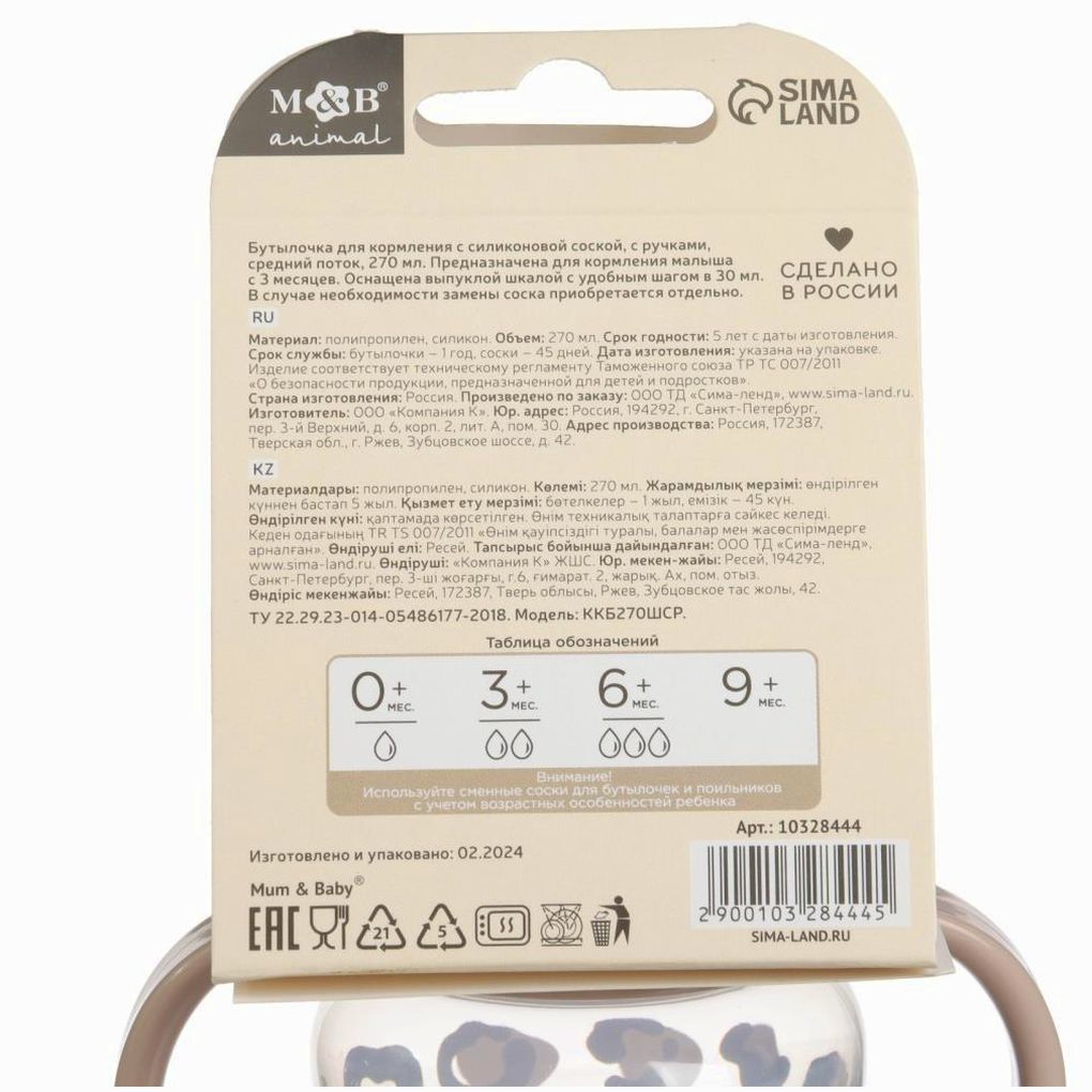 Детская бутылочка изготовлена в России из сырья отечественного производства. Все материалы сертифицированы и безопасны для здоровья новорождённых. Полипропилен и силикон не выделяют вредных веществ при стерилизации и контакте с жидкостью.
