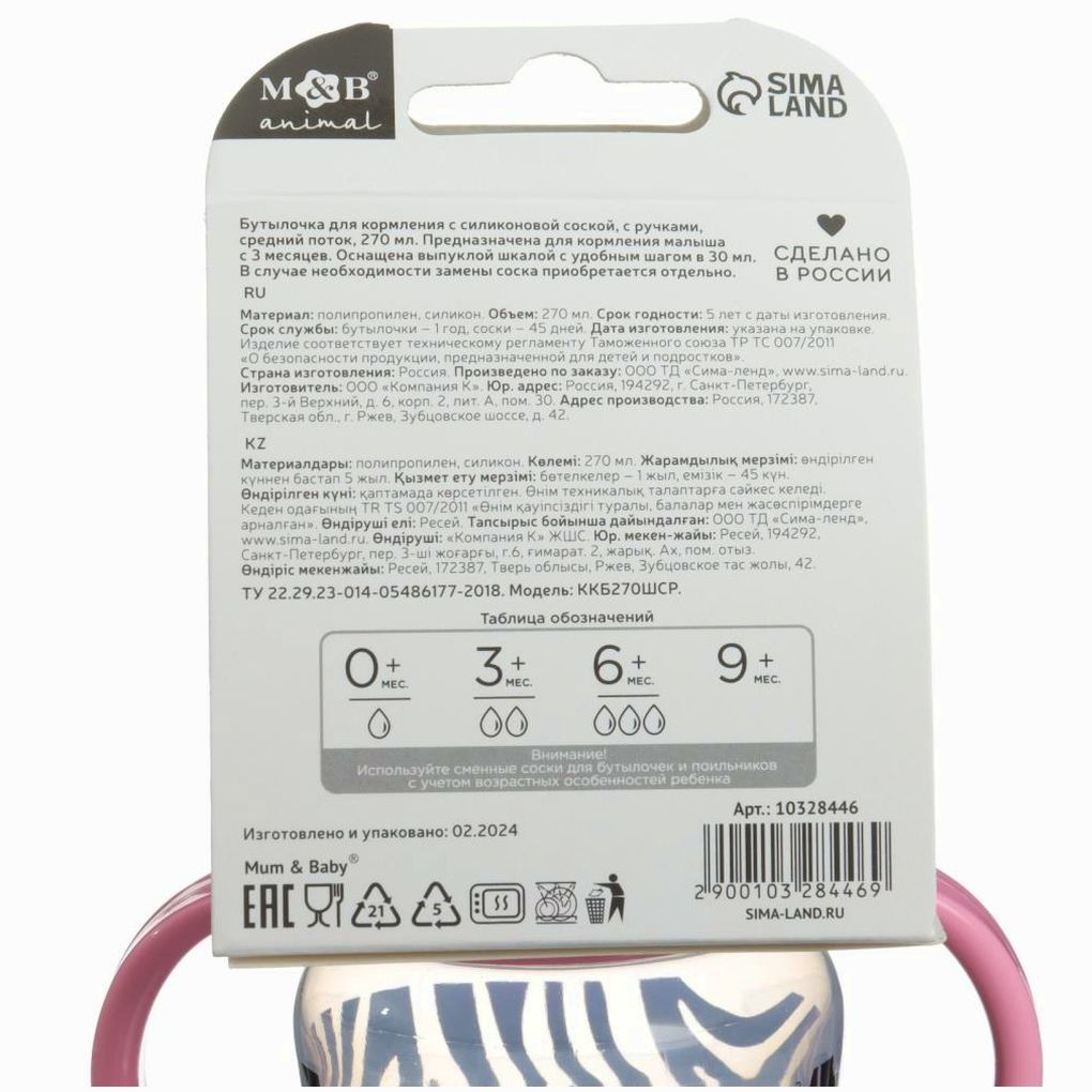 Детская бутылочка изготовлена в России из сырья отечественного производства. Все материалы сертифицированы и безопасны для здоровья новорождённых. Полипропилен и силикон не выделяют вредных веществ при стерилизации и контакте с жидкостью.
