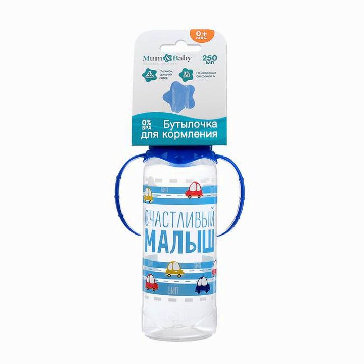 Бутылочка для кормления «Малыш», классическое горло, с ручками, 250 мл, от 0 мес., цвет синий (№2969820).
