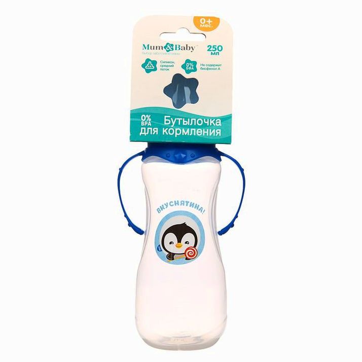 Бутылочка «Пингвинёнок Рокки» приталенная, с ручками, 250 мл, от 0 мес., цвет синий (№2969821).