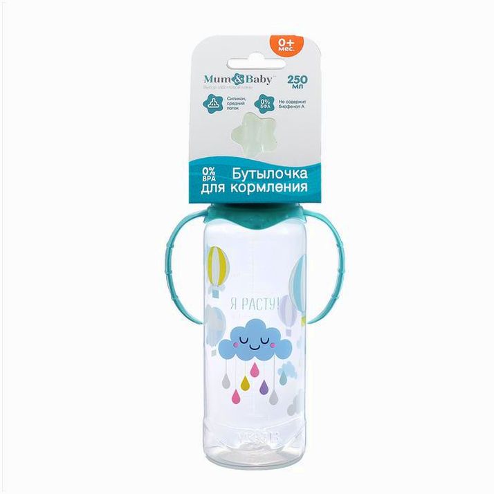 Бутылочка «Нежное облачно», классическое горло, с ручками, 250 мл., от 0 мес., цвет бирюзовый (№2969844).