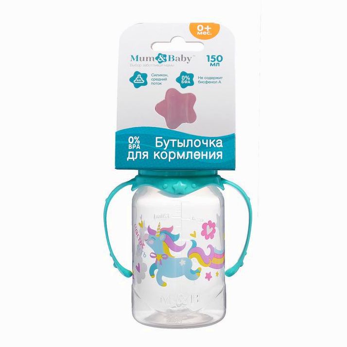 Бутылочка «Волшебная пони», кдассическое горло, с ручками, 150 мл, от 0 мес., цвет бирюзовый (№2969884).