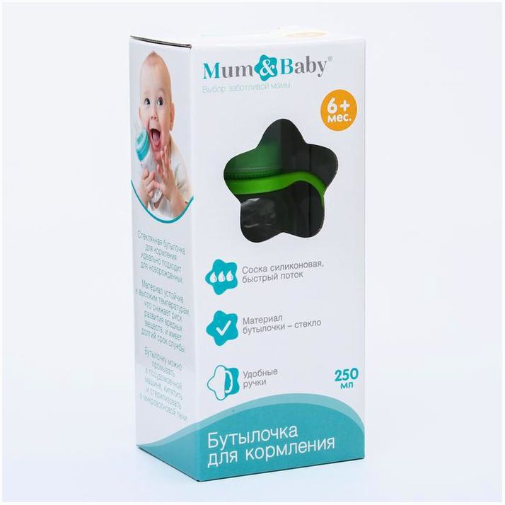 Бутылочка для кормления, стекло, 250 мл., с ручками, цвет МИКС (№4627671).