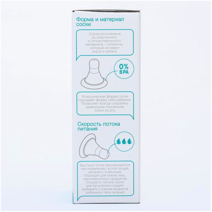 Бутылочка имеет мягкую и гибкую соску, которая не слипнется и будет удобно располагаться у малыша во рту.