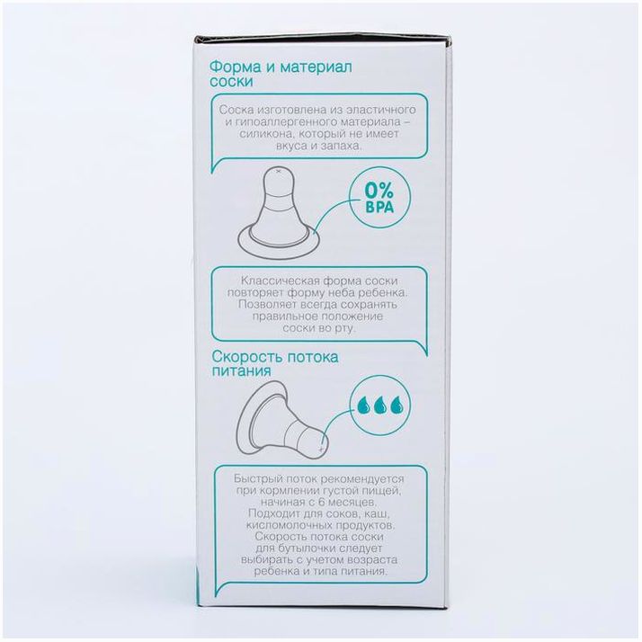 Бутылочка имеет мягкую и гибкую соску, которая не слипнется и будет удобно располагаться у малыша во рту.