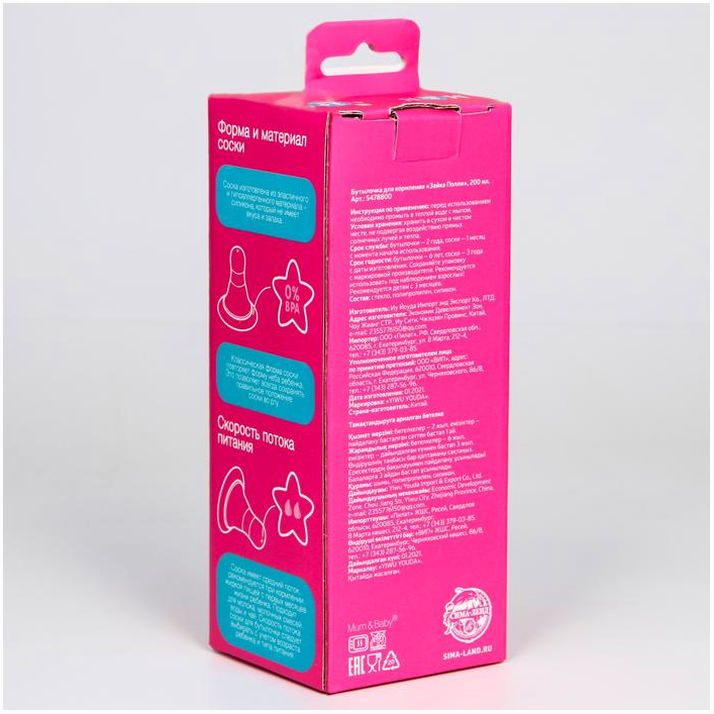 Бутылочка имеет мягкую и гибкую соску, которая не слипнется и будет удобно располагаться у малыша во рту.