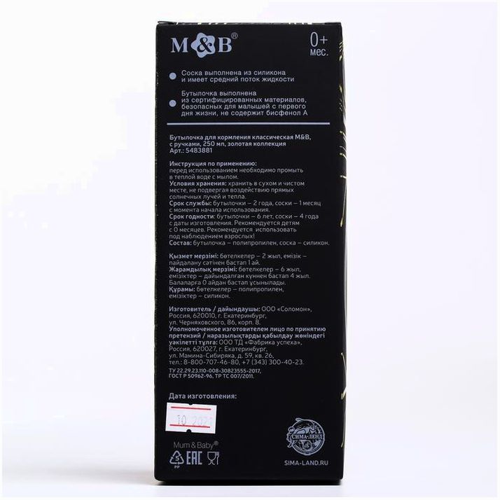 Детская бутылочка изготовлена в России из сырья отечественного производства. Все материалы сертифицированы и безопасны для здоровья новорождённых. Полипропилен и силикон не выделяют вредных веществ при стерилизации и контакте с жидкостью.