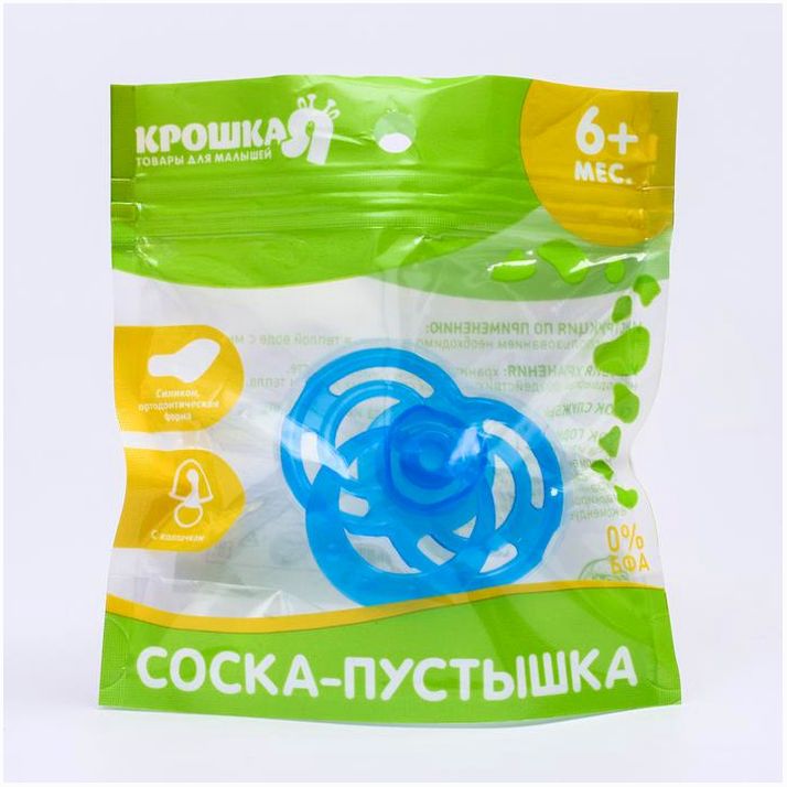 Соска пустышки силиконовая и имеет анатомическую форму диска, специальные вентиляционные отверстия на пустышке улучшают циркуляцию воздуха не раздражают кожу малыша и не оставляют следов и опрелостей. Создана для удовлетворения естественного сосательного рефлекса малышей. Пустышка анатомической формы имеет немного сплюснутый сосок, благодаря чему прилегает к языку.