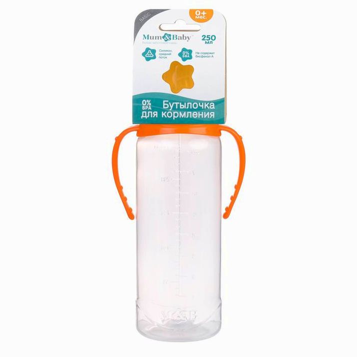 Бутылочка классическая, с ручками, 250 мл, от 0 мес., цвет оранжевый МИКС (№2969743).