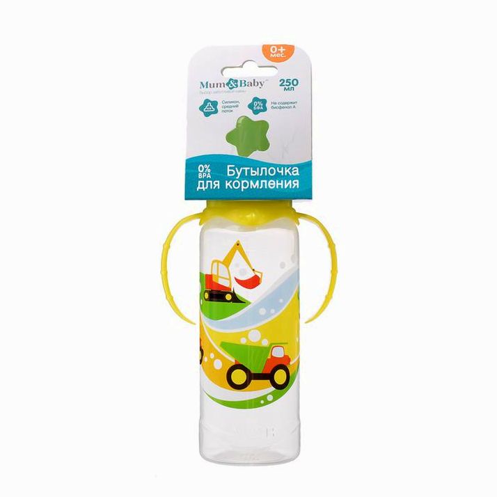 Бутылочка для кормления «Транспорт», классическое горло, с ручками, 250 мл., от 0 мес., цвет жёлтый (№2969830).