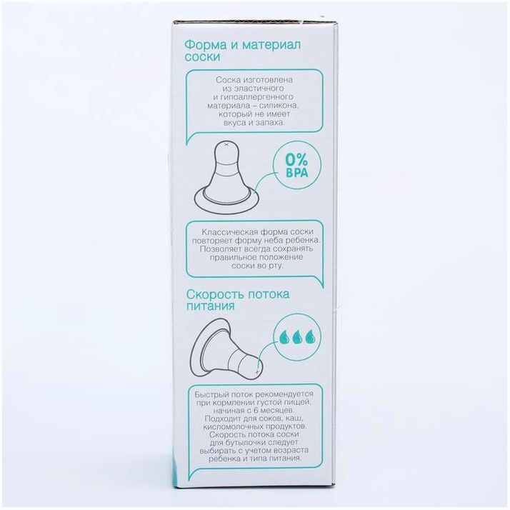 Бутылочка имеет мягкую и гибкую соску, которая не слипнется и будет удобно располагаться у малыша во рту.