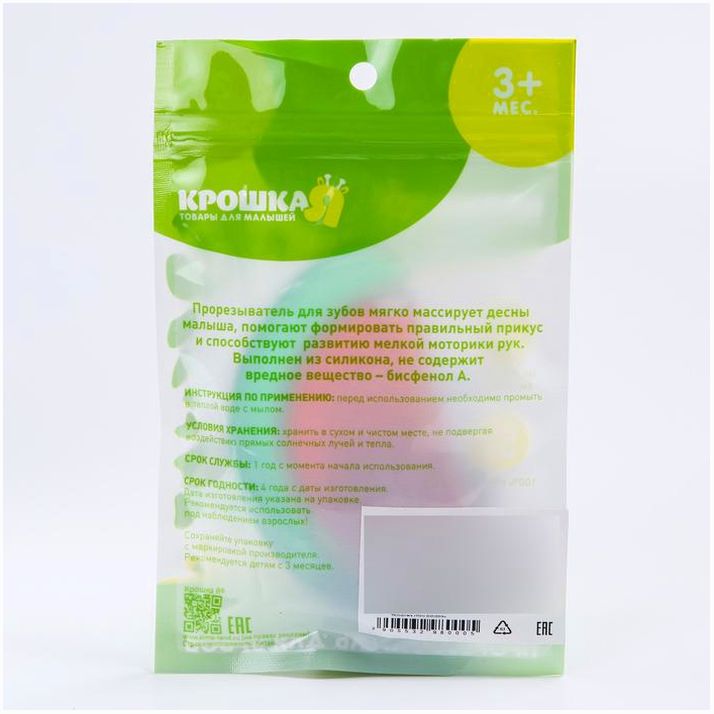 Прорезыватель снимает неприятные ощущения в период появления первых зубов. Также изделие подготовит ребёнка к процессу жевания, поспособствует формированию правильного прикуса и развитию мелкой моторики рук.
