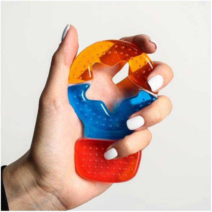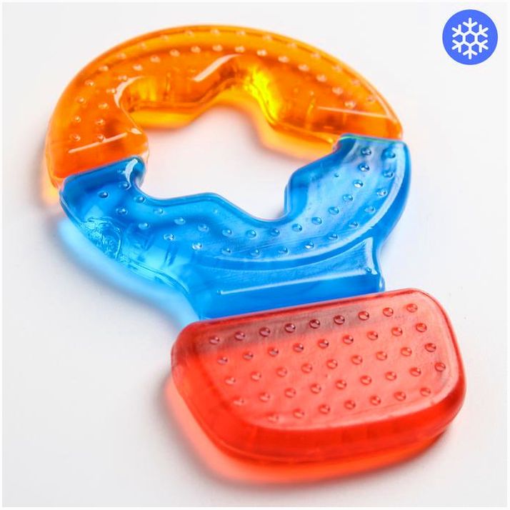 Специальная жидкость внутри поможет снизить воспаление в ротовой полости и снять болевые ощущения. Для охлаждения прорезывателя поместите его в холодильник на 10?15 минут. Форма ручки и размеры разработаны специально для детской ладони, поэтому малышу будет удобно её держать. Рельефная структура на поверхности изделия и его дополнительных элементов будет способствовать развитию мелкой моторики, а яркие цвета — формированию визуального восприятия мира.