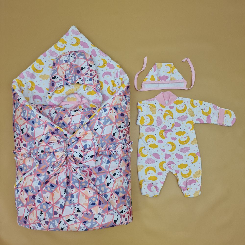 Конверт комплект на выписку 5 пр: одеяло+комбинезон+шапочка+чепчик+бант (№1892д-2-2_к_54) цвета в ассортименте.