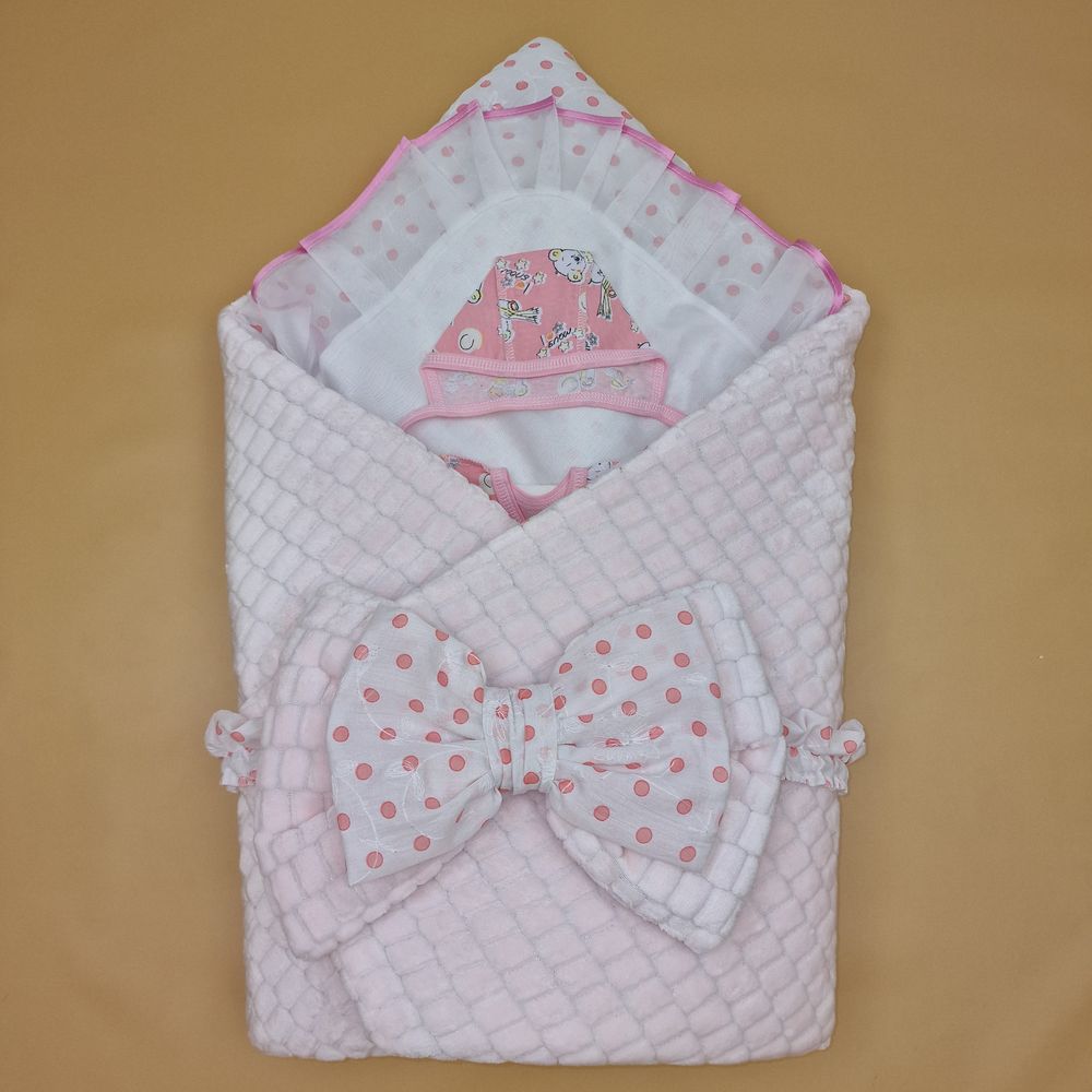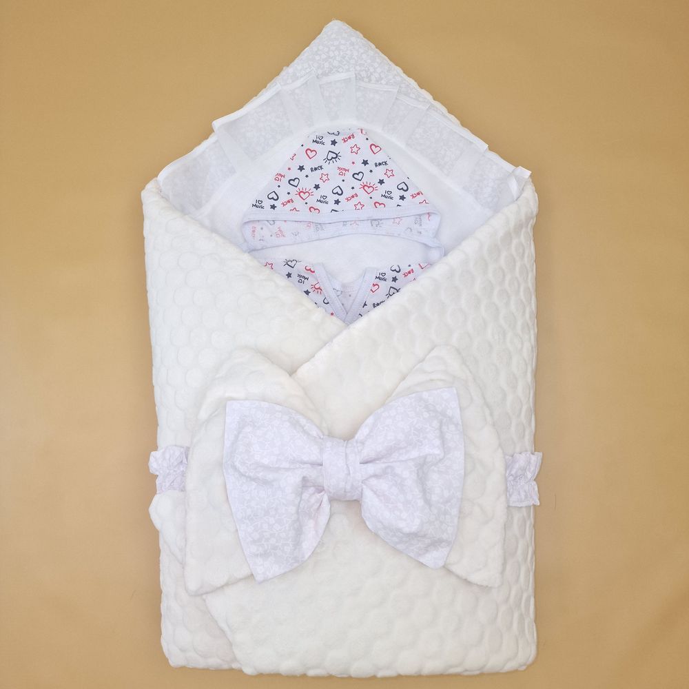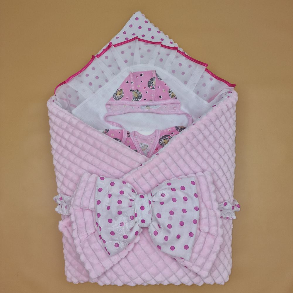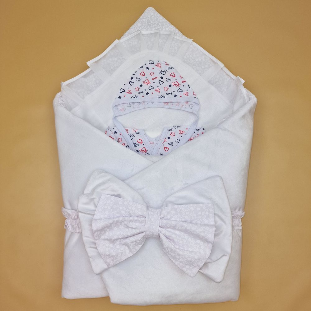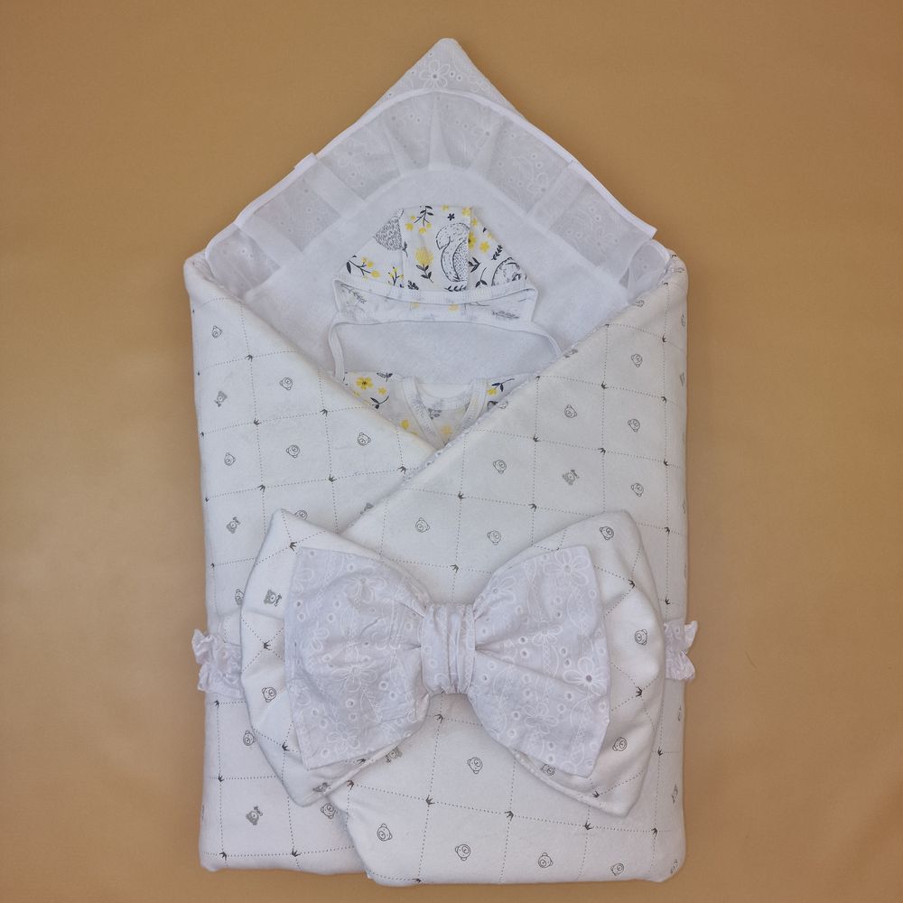 Конверт комплект на выписку 6 пр: одеяло+уголок+распашонка+пеленка+чепчик+бант (№1889в-0-2_о) цвета в ассортименте.