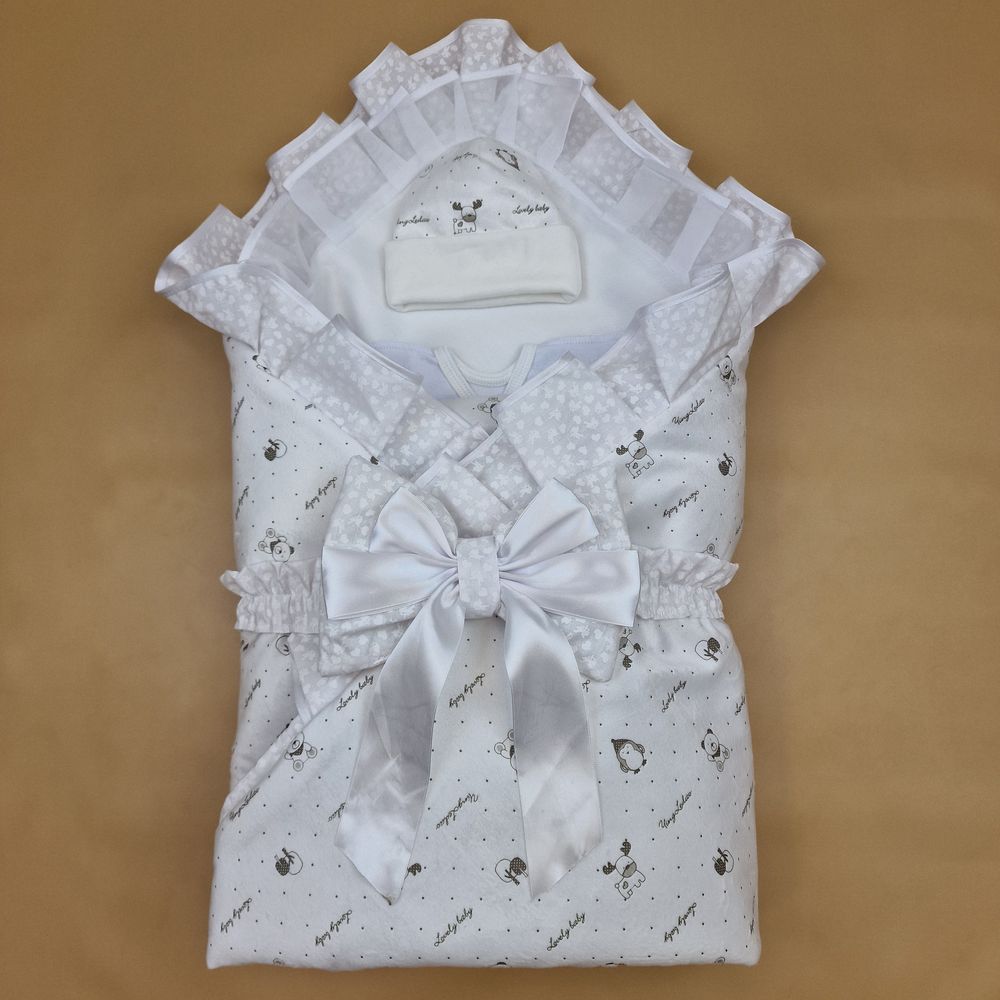 Конверт комплект на выписку 7 пр: одеяло+уголок+ползунки+пеленка+распашонка+шапочка+бант (двухсторонний) (№1877в-1-1_о_09) цвета в ассортименте.