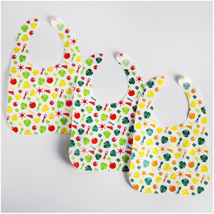 Товар изготовлен из материалов, не содержащего токсичных веществ. После использования мойте тёплой мыльной водой. Нагрудник рекомендован для детей старше 4 месяцев. В наборе 3 нагрудника с разным рисунком.