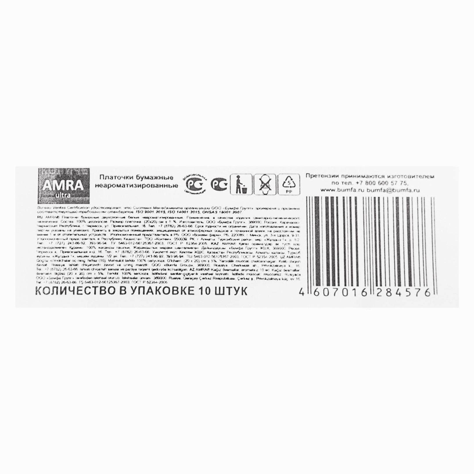 Платочки бумажные «Amra» не ароматизированные, 10 шт (№1112346).