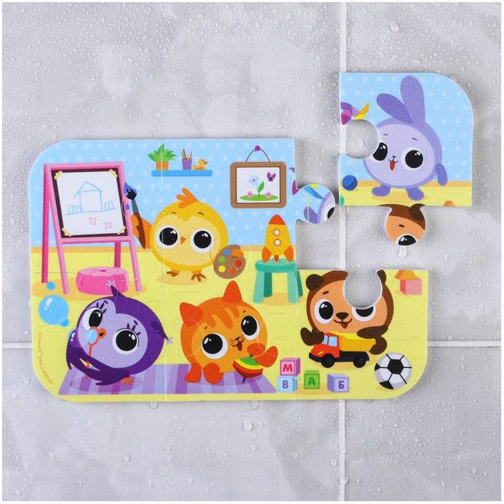 Забавные игрушки из мягкого материала не тонут в воде и при намокании приклеиваются к кафелю или ванне.
