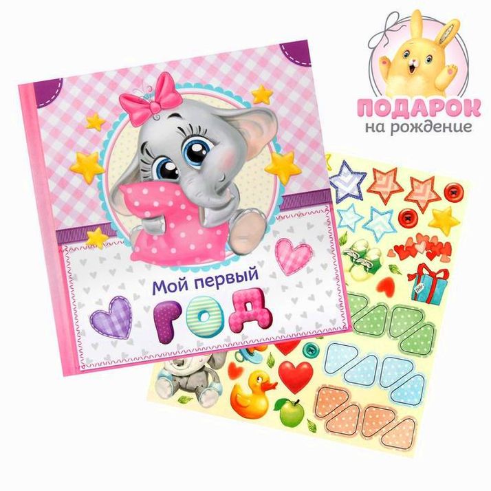 Она состоит из 20 страниц с индивидуальным дизайном, которые позволят разместить первые фотографи и крохи и все его достижения за год: первые шаги, первый смех, первая спокойная ночь. В итоге у вас получится занимательная история самого важного в жизни периода. А с помощью ярких наклеек из комплекта книгу можно украсить!