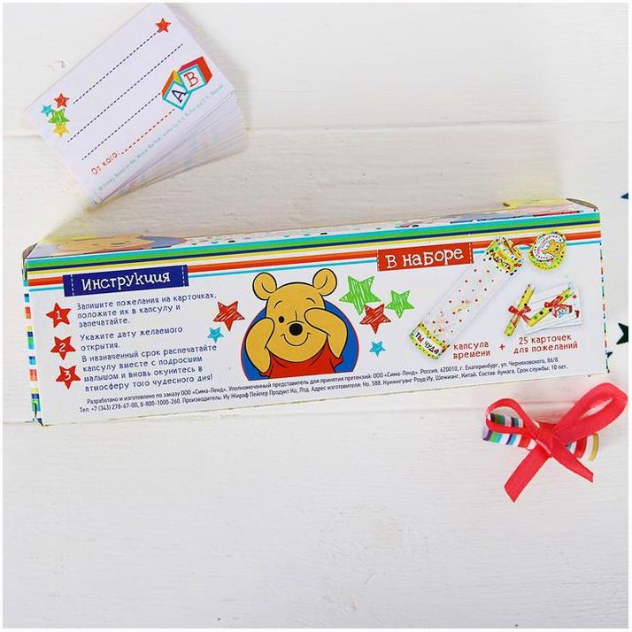 В набор входят: пластиковая ёмкость, 2 крышки, 25 карточек и 25 ленточек. Запишите на листочках, когда малыш пошёл, сказал первое слово или сделал что-то сам, и дополните их пожеланиями. К крышке прикреплён шильдик для записи дат: когда капсула была запечатана и когда её нужно вскрыть.
