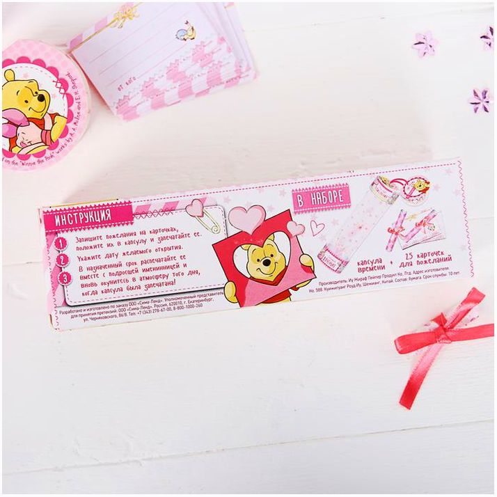 В набор входят: пластиковая ёмкость, 2 крышки, 25 карточек и 25 ленточек. Запишите на листочках, когда малыш пошёл, сказал первое слово или сделал что-то сам, и дополните их пожеланиями. К крышке прикреплён шильдик для записи дат: когда капсула была запечатана и когда её нужно вскрыть.