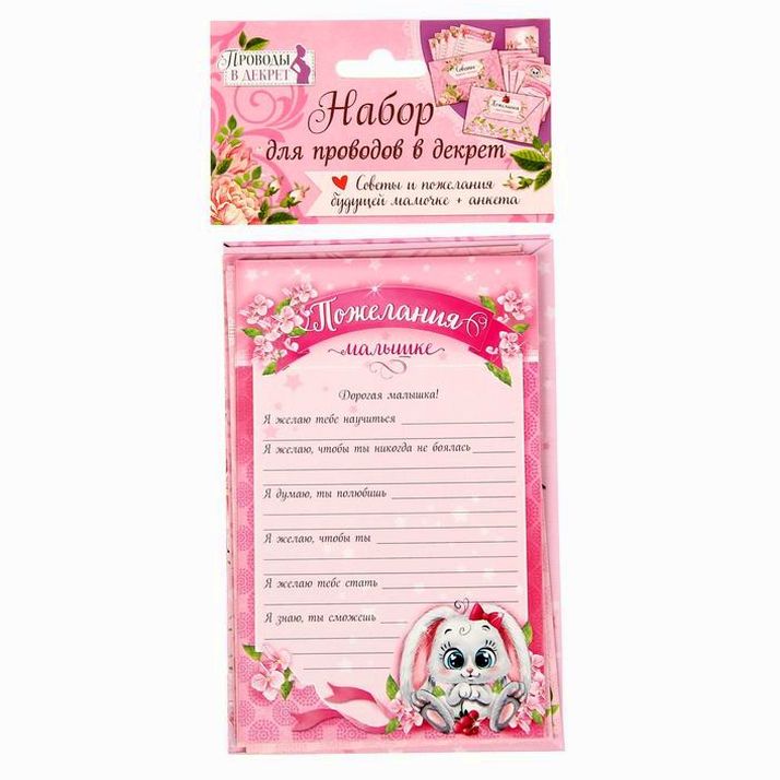 Нежный дизайн набора будет поднимать обладательнице настроение каждый день. В анкете она опишет свои эмоции во время этого чудесного периода. Напишите на бланках советы, которые пригодятся мамочке в декрете. Карточки с добрыми словами она сохранит в конвертах, а когда малютка подрастёт, сможет прочитать их вместе с ним.