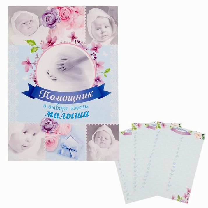 В комплект входят 3 карточки, на которых коллеги, друзья и близкие могут написать варианты, а родители затем выберут наиболее подходящие. Внутри также есть советы и наиболее популярные имена.
