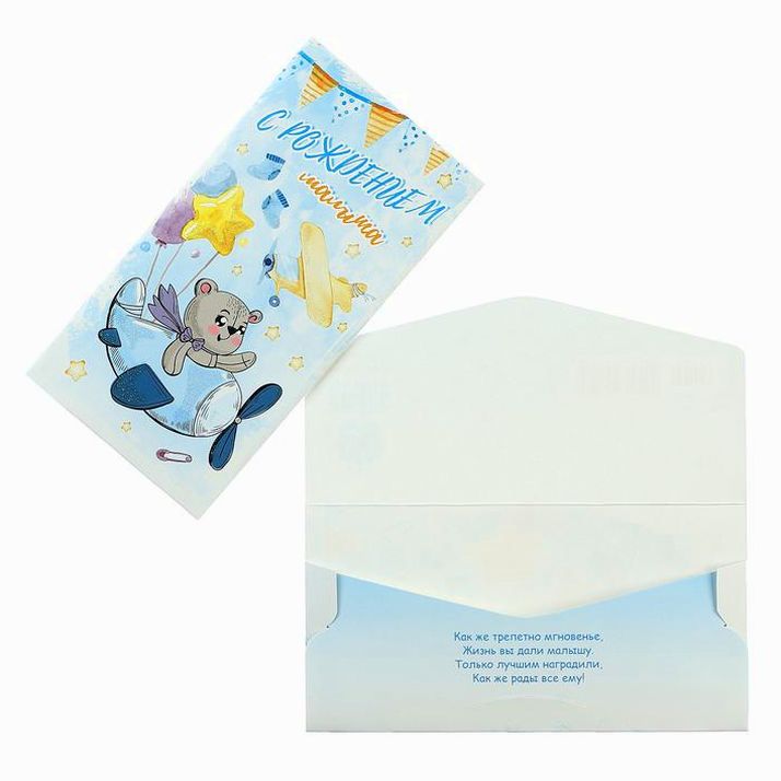 Конверт для денег "С Рождением Малыша!" глиттер, мишка на самолёте (№4922355).