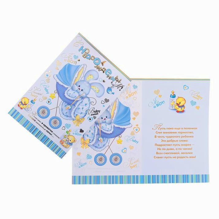 Открытка "С Новорожденным!" тиснение, зайка в коляске (№4150626).