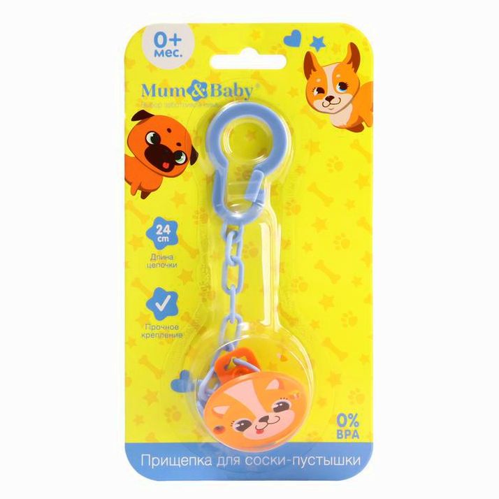 Изделие фиксируется на одежде ребёнка. На конце цепочки есть карабин, который зацепляется за кольцо пустышки. Надёжное крепление убережёт вещь от падения на пол, если малютка случайно выронит её изо рта.