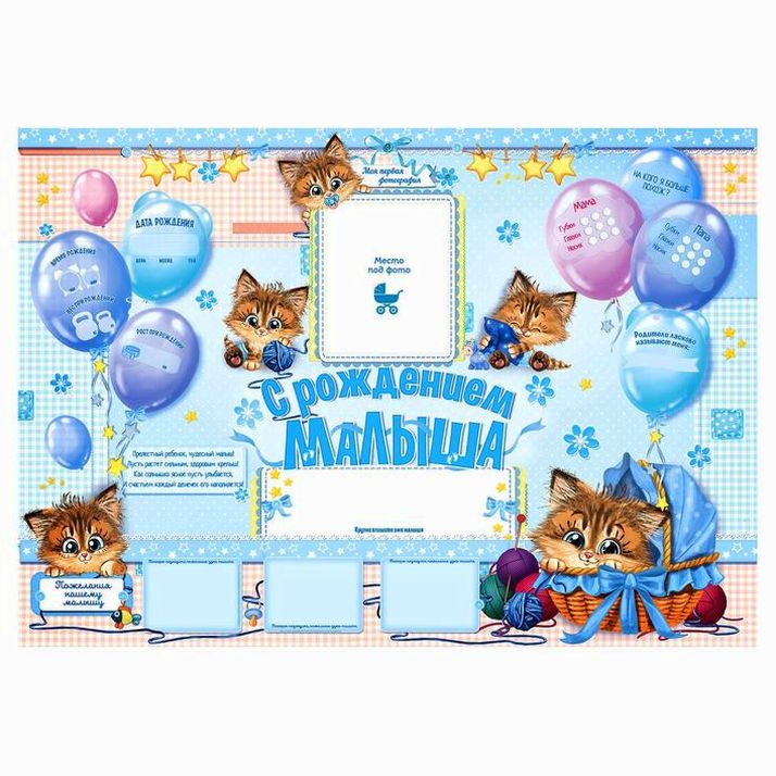 Вручите молодым родителям поздравительные медали. Прикрепите плакат на стену с помощью кнопок или клейкой ленты. Дополните его фотографией малыша. На украшении есть специальные поля для имени, даты рождения, роста и веса крохи. Специальная табличка поможет выяснить, на кого же похоже маленькое солнышко: на мамочку или папочку?