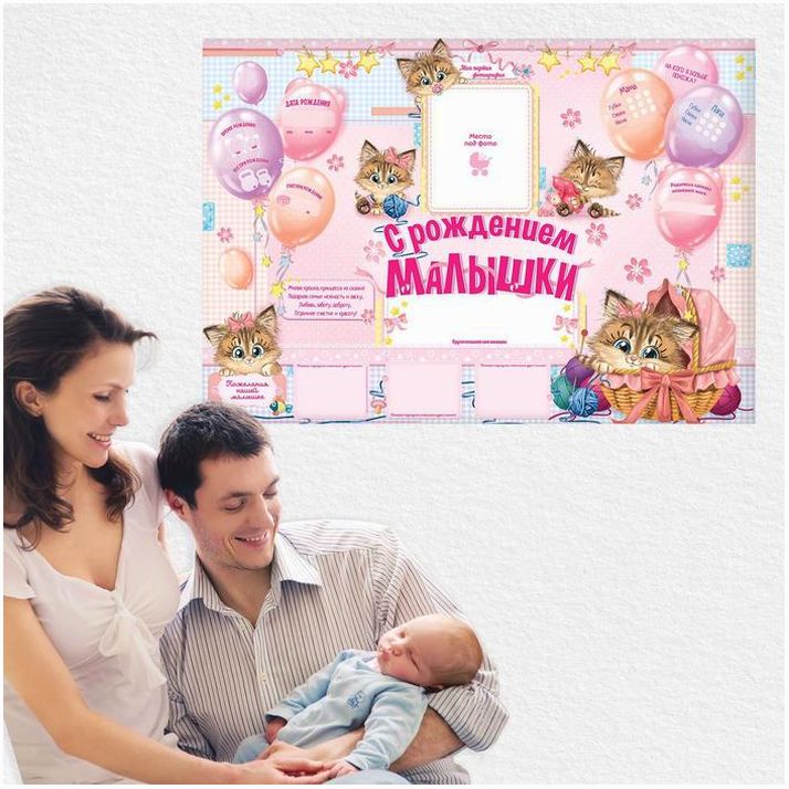 Вручите молодым родителям поздравительные медали. Прикрепите плакат на стену с помощью кнопок или клейкой ленты. Дополните его фотографией малыша. На украшении есть специальные поля для имени, даты рождения, роста и веса крохи. Специальная табличка поможет выяснить, на кого же похоже маленькое солнышко: на мамочку или папочку?