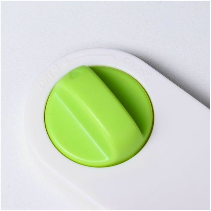 Ограничитель крепится на гладкие поверхности за счёт клейкого слоя. Чтобы открыть замок, поверните ручку против часовой стрелки. После использования шкафа верните блокиратор в первоначальное положение и зафиксируйте его.