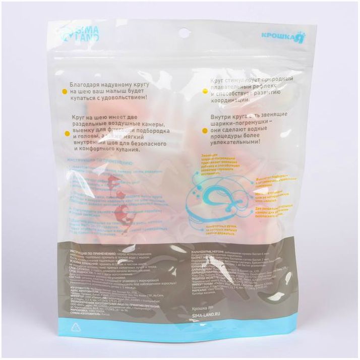 - Комфортное использование: надувной эластичный обод предупреждает давление на шею ребёнка, мягкая вставка для подбородка поддерживает головку над водой, а в местах соприкосновения с кожей круг обработан по технологии «внутреннего шва» (гладкий материал не натирает нежную кожу ребёнка).