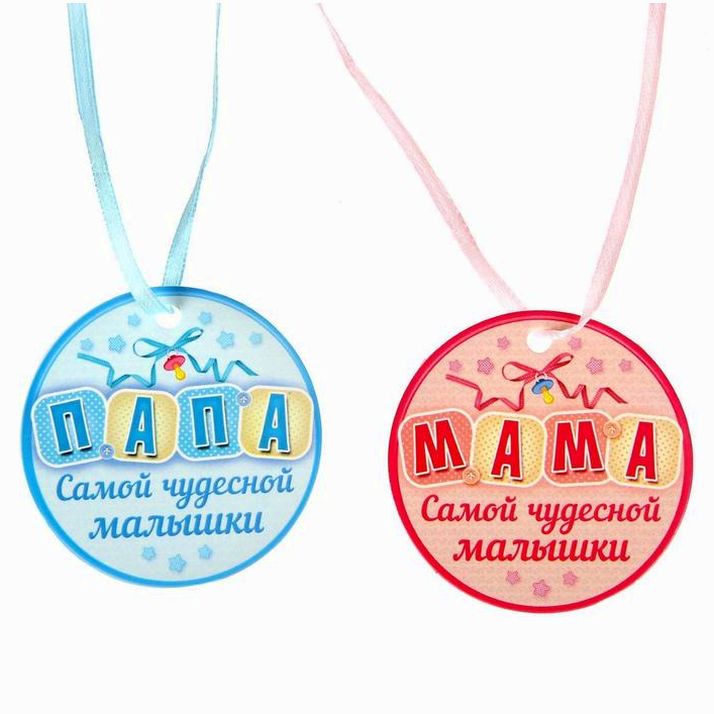 Вручите молодым родителям поздравительные медали. Прикрепите плакат на стену с помощью кнопок или клейкой ленты. Дополните его фотографией малыша. На украшении есть специальные поля для имени, даты рождения, роста и веса крохи. Специальная табличка поможет выяснить, на кого же похоже маленькое солнышко: на мамочку или папочку?